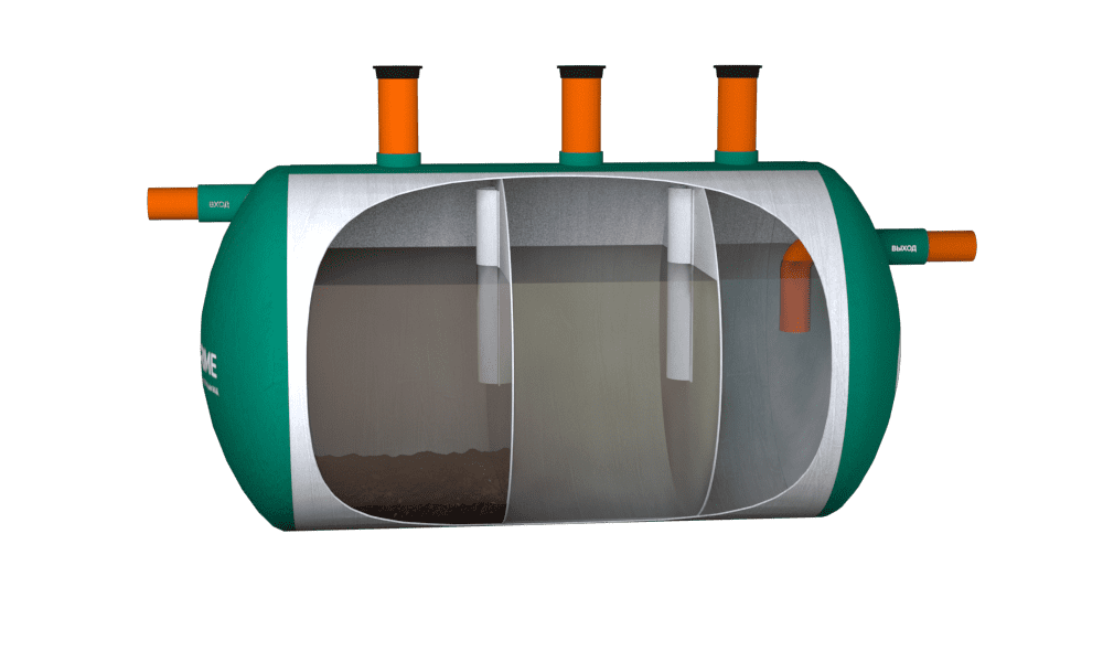 Септик это компактная ЭНЕРГОНЕЗАВИСИМАЯ емкость. Состоит из 4-х или 3-х камер, в которых поэтапно, очищаются сточные воды до 85 %.